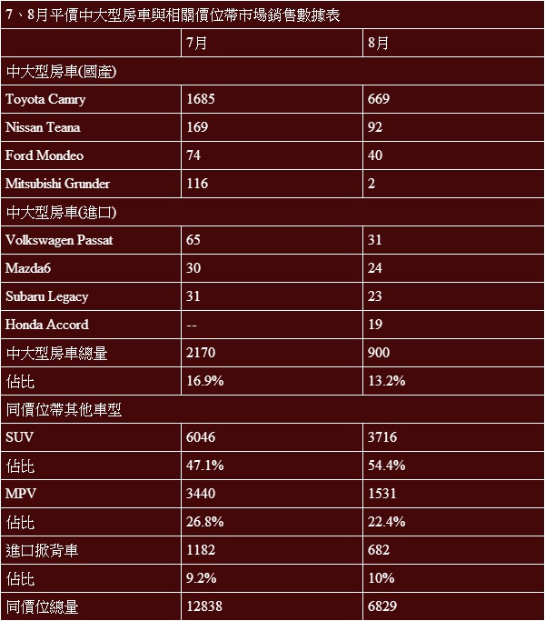 不過,事實真是如此嗎?在這個月初整理8月份市場銷售數據,以及稍早進行平價中大型房車集評時,我們發現中大型房車相對於整體市場來說,似乎越來越不具重要性,從下方整理表格中數據,我們找出相對較主流品牌車款計算,台灣市場8月份國產加進口中大型房車總共只賣出900輛,要知道,這裡頭可包含了Camry、Teana、Mondeo、Grunder等國產車以及Passat、Mazda6、Legacy、Accord等進口車,每一款想當年都是賣得嚇嚇叫的車款,現在除了Camry以外卻沒有一款擁有銷量破百的能耐(甚至除了Teana的92輛外,其他都賣不超過40輛),就連Camry也僅有669輛的實力,要知道8月份儘管受制民俗月,銷售數量因此受到嚴重影響,然而該月份單就國產中大型房車而言僅佔全國汽車總銷售量的3.8%,由此數據就可知道中大型房車有多不受市場喜愛。