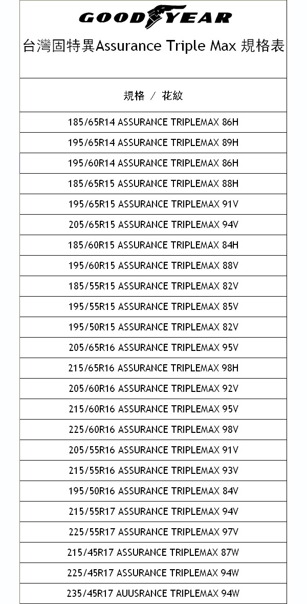 台灣固特異股份有限公司提供了Assurance TripleMax 非常齊全之規格,從14吋到17吋,合計約31個規格,並搭配”固特異安心專案”(詳洽固特異特約服務中心),讓您購買安心、使用放心,對此款新產品更加有信心。