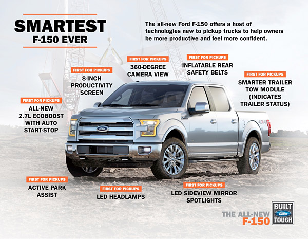 Ford汽車長年耕耘車用智慧科技研發,並且逐步推廣至旗下各式車款。全新Ford F-150皮卡休旅車導入SYNC® with MyFord TouchTM,擁有360度環景影像系統,能提供如鳥瞰般的全景視野,同時也是皮卡市場上首部搭載LED頭燈及車室照明系統的車款,提升耐用度同時在細節處節省電能。