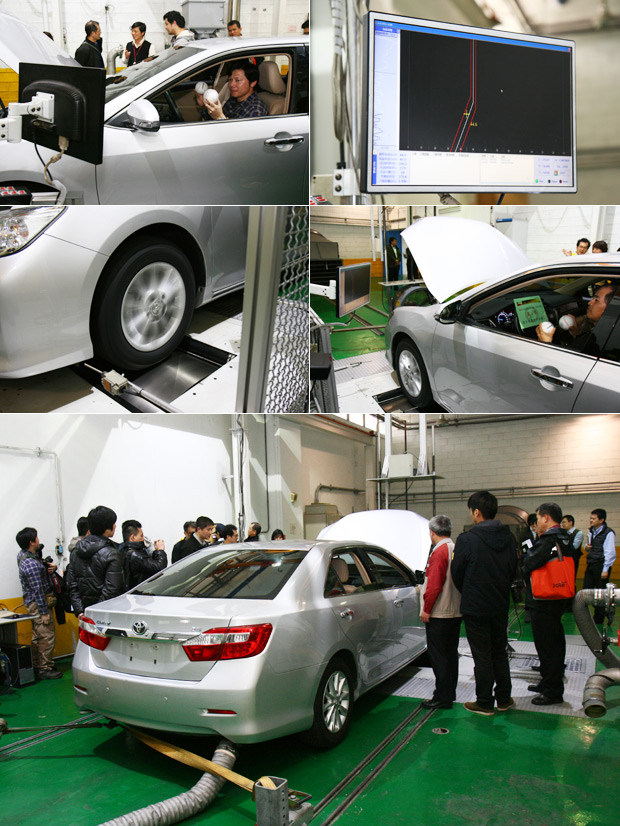 實際運轉測試時,測試員的雙手不得碰觸方向盤,以避免車輛偏轉發生意外,這時測試員僅能以「黃金右腳」控制油門深淺,並按照螢幕圖示的紅線區間踩踏油門,這一趟下來的測試時間約20分鐘,因此測試員必須十分專注才行。螢幕圖示為歐規模式,因此兩道紅線的間距較窄,根據ARTC官方表示,大部份測試的客戶都選擇美規法規,因為測試規範方面較為寬鬆。