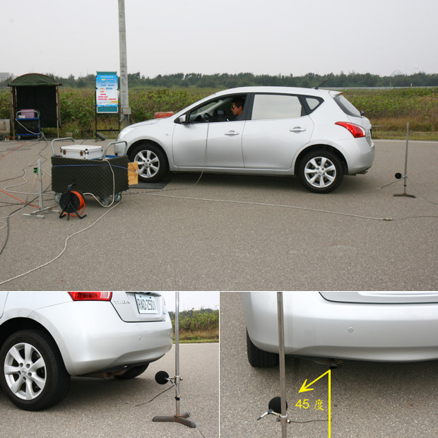 最後是車輛靜止、與動態的噪音測試,首先是靜止測試,收音器設置的基準是與排氣管同高,然後放置於45度角的斜角、距離50公分遠。