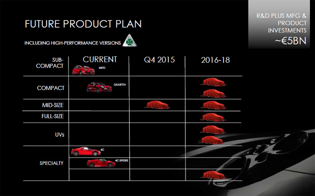 身兼Alfa Romeo與Maserati兩品牌執行長的Harald Wester,在發展計劃的簡報中公開了Alfa的新車攻勢規劃,此攻勢將由2015年第二季發表的中型車展開,而2016至2018年則是Alfa火力集中的時段,期間將擴展包括兩款小型車、另一款中型車、一款大型車、兩款跨界休旅、以及一款跑車等共7款的新車,包含2015年發表的中型車在內,2018年Alfa Romeo將擁有多達8款的全新車型。