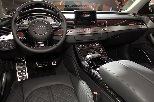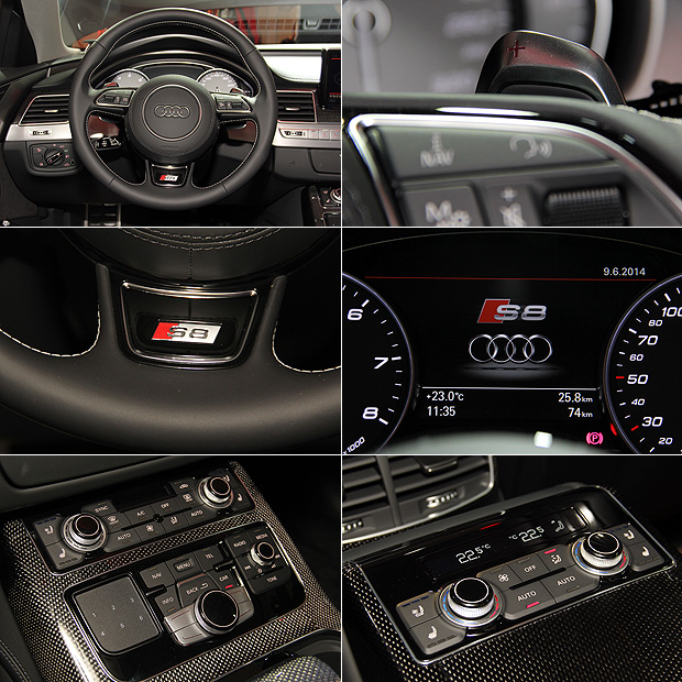 座艙內部保留下A8車系的環抱式設計,由於位處性能旗艦的設定,S8捨棄了彰顯奢華氣質的原木飾板,導入碳纖維與金屬飾板,搭配車門內側的麂皮包覆、嵌有S8徽飾與對比色縫線的3輻式方向盤、表底烙有S8字樣的雙環式儀表板以及金屬踏板組等,營造戰鬥氣息較為濃厚的座艙氛圍。不僅如此,方向盤上的換檔撥片也同步加大尺寸,以應付激烈操駕時的需求。