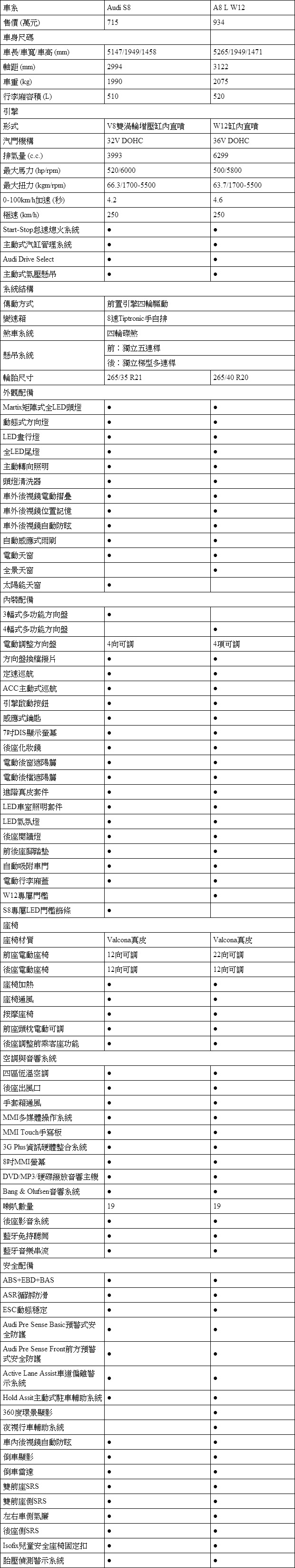 Audi S8/A8 L W12規格配備表: