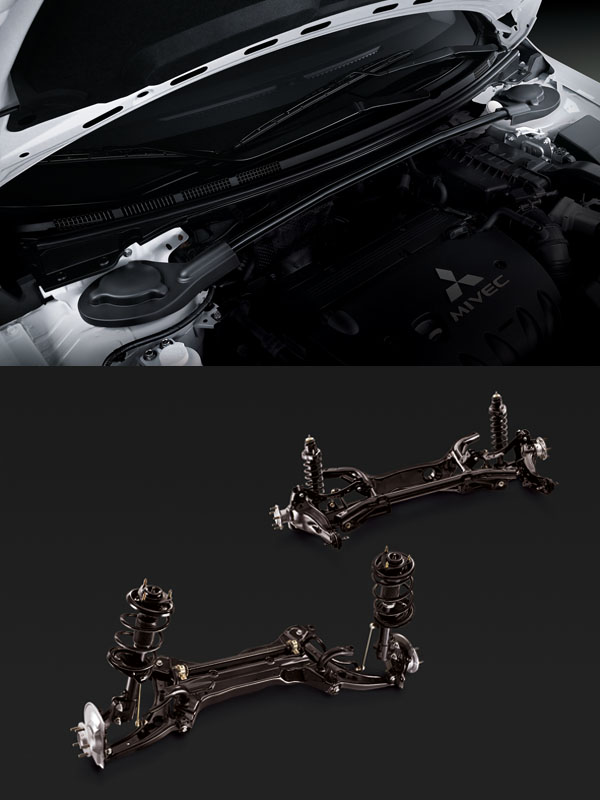 底盤部分,在前獨立麥花臣/後獨立多連桿式懸吊(附防傾桿),結合高強度橫樑基礎結構下,Lancer iO的懸吊系統全面強化,具備國產同級車中唯一經原廠調校、專供運動型房車使用的MDSS運動化懸吊系統(Mitsubishi Dynamic Suspension System),其彈簧、減震筒與防傾桿均以Lancer EVO車款參加賽事獲取之經驗為藍本,優先考量操控性調校而成,不但減震筒阻尼增加,彈簧磅數也增加,防傾桿的直徑更為加粗,再搭配同級車唯一的引擎室拉桿增加車身剛性,創造出更穩定的操控與更精準的動態反應。