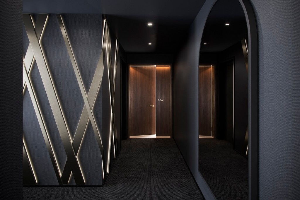 當首次下電梯時,他們會看到帶有Aston Martin標誌性X圖案青銅飾面的室內設計元素。在青銅色的細節下方是由Adjaye Associates設計的壁紙,而由Aston Martin Design設計的定制煙燻玻璃鏡子以獨特的拱形形式反映了紐約天際線景觀,這是對立面拱形的致敬。