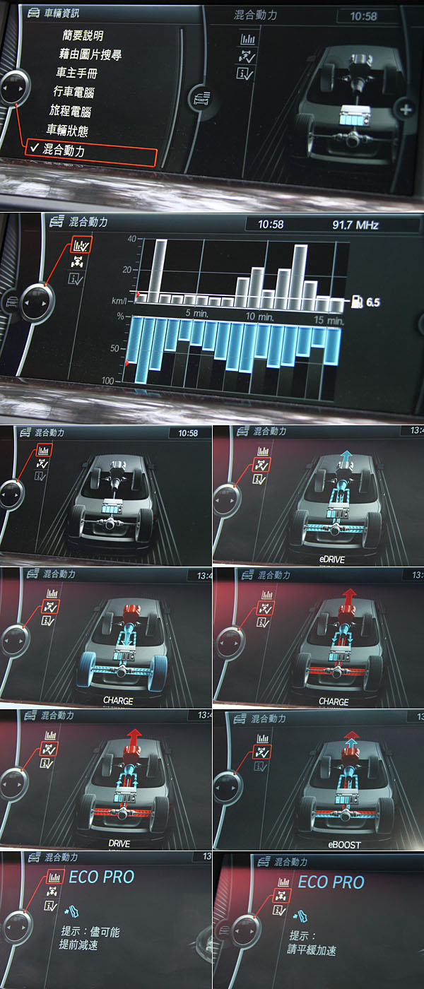 也不免俗的,在ActiveHybrid 5的儀表與iDrive系統內,為了讓你了解目前車輛動能輸出的狀態,是引擎輸出?是電力輸出?是一起輸出?正在電能回充?等狀況,有著挺清楚且明瞭的輔助儀表甚至動畫,但如真要看圖駕車,一點一滴的計較那油量的輸出多寡,那與BMW強調的駕駛樂趣,我認為應該是會有點抵觸的。