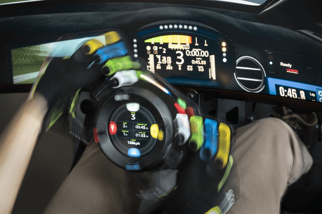 與自動調平的中央螢幕一起,該方向盤具有多項人體工程學考慮,包括背光按鈕環繞、兩個七向方向桿和兩個大型鋁製旋轉輸入。後部有四個磁性撥片:兩個用於換檔,兩個用於附加輸入,以及一對模擬離合器撥片。撥片的設計來自Bentley Continental GT公路車的換檔撥片。