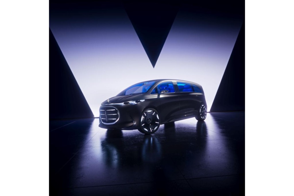 在外觀方面,全新概念車 Vision V 承襲 Mercedes-Benz 「感性純粹 Sensual Purity」設計語彙,輪廓簡潔流暢、線條優雅銳利。其雕塑般的外觀以創新美學和最高標準的空氣動力學為特徵,流線型輪廓象徵著力量和動感輕盈。車頭以三道發光玻璃飾條結合三芒星頭燈與迎賓光影效果,展現未來車型的前衛設計。車側設有「迎賓入口」自動門與伸縮式迎賓踏板,搭配 B 柱上的迎賓互動螢幕和自動迎賓門檻燈,提供專屬尊榮的迎賓體驗。車尾則以超過 450 個立體光條打造科幻尾燈組,使光影流動間散發出豪華氛圍;而具有發光飾條的 24 吋輪圈和動態尾燈,在行進中則創造極具未來魅力的視覺效果。