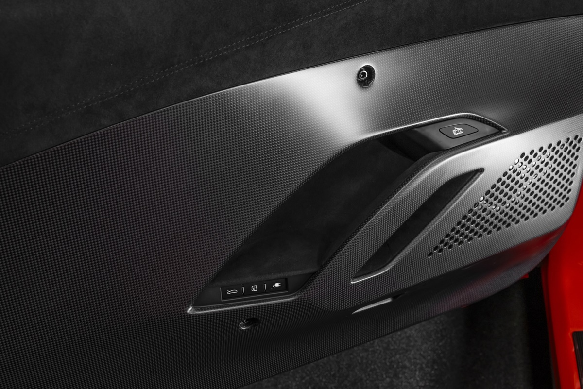 專為Ferrari 296 Speciale A量身打造的車門飾板,採用一體式碳纖維結構,極致展現簡潔俐落的設計語彙。車門把手巧妙整合功能區域,微微隆起的造型自然延伸至簡潔流暢的型面,展現獨特美感。此外,為確保材質一致性,高傳真音響系統的揚聲器亦整合於此區域,低音單體透過碳纖維面板上精心排列的小孔傳遞聲音,兼具功能與視覺效果。