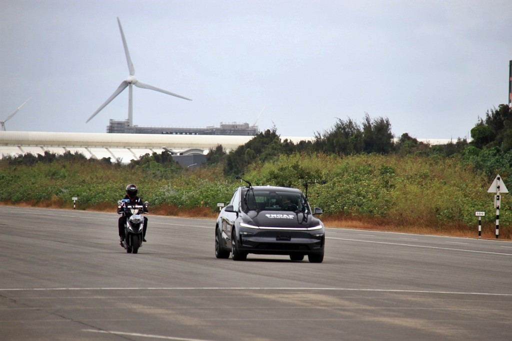 2.盲點輔助系統(BSD)試驗:模擬機車行駛至受驗車輛側方時,系統偵測機車並提供駕駛警示提醒,期能降低車輛變換車道時的側方碰撞風險。
