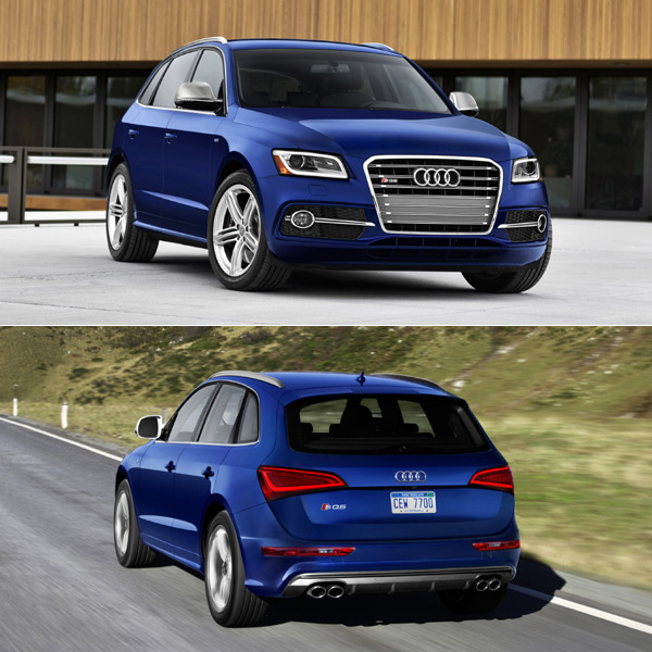 SQ5 TDI與TFSI車型在內外都擁有相同的專屬配備,外觀唯一的差別,就是美規車型特有的橘黃色方向燈了;外觀上,SQ5 TFSI同樣配置整合類鋁合金橫輻的白金灰水箱護罩,此外還有類鋁合金的後視鏡外蓋、以及後保桿分流器與側裙等空力套件,而Audi也提供Estoril藍、與Panther黑兩款專屬的水晶色烤漆選用。