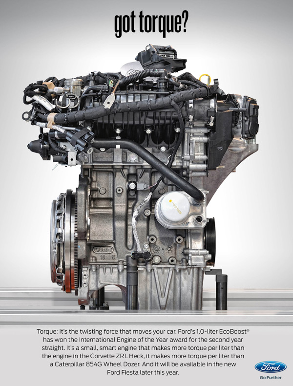 Ford原廠在1.0 EcoBoost引擎獲獎後所推出的平面廣告,文中不忘幽默一下Corvette ZR1跑車與Caterpillar建機,並指出1.0 EcoBoost引擎的扭力輸出效能。