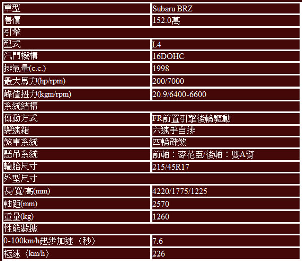 比起自排設定的車款,手排車款不僅解放了動力輸出上的隔閡感,剛剛好的動力輸出與後輪驅動設定,加上可多段控制的電子輔助系統,可搭配出多種的操控特性,可讓初次入手後驅跑車的車迷,循序漸進的感受後驅跑車地駕馭樂趣,而且BRZ是目前台灣市場上最容易擁有採前置引擎、後輪驅動的手排小跑車,若再往上選擇,手排跑車也就只有Caterham全車系為前置引擎、後輪驅動配置,相較之下,更顯現出BRZ的獨有魅力。