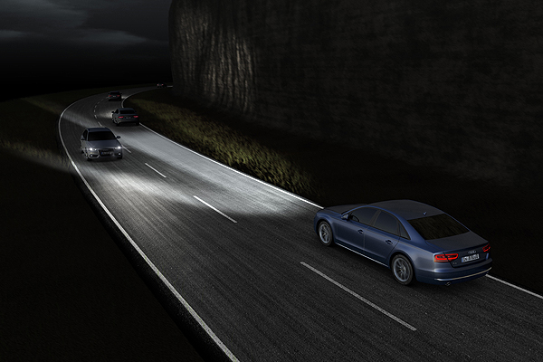 即將運用在小改款A8的矩陣式LED頭燈,將會整合25具高強度的LED發光單體,並以5個單體為一組的模式,搭配一組反光鏡,運用電子控制機構控制投射的角度與照明亮度。當頭燈設定處於Automatic自動模式,並切換至遠光燈狀態下,若是車輛行駛於高速公路,系統會在30km/h以上的速度自動啟動。而在市區行駛之下,則是必須在車速高於60km/h才會自動啟動,再給予充足罩名的同時,也能避免強光對於周邊人車的影響。