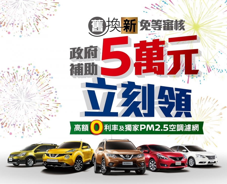 消費者凡於即日起至3月底止,於全國Nissan展示中心換購新車,除可於完成購車及申請減徵貨物稅手續後立即獲得新臺幣5萬元的定額減徵貨物稅,購買Nissan國產車系及進口車JUKE者更加碼贈送PM2.5 安心清淨交車禮及享高額零利率優惠專案,裕隆日產誠摯邀請消費者親臨全國Nissan展示中心或至Nissan官網www.Nissan.com.tw瞭解相關活動辦法及條件詳情。