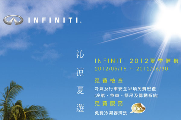 Infiniti 2012夏季健檢服務活動,除了提供四大系統32項免費檢查外(註1),同時加贈價值新台幣900元的冷凝器清洗免費服務,另提供「夏季酷爽套餐」、「視野清晰套餐」及「剎的住套餐」等超值保養優惠(註2)。