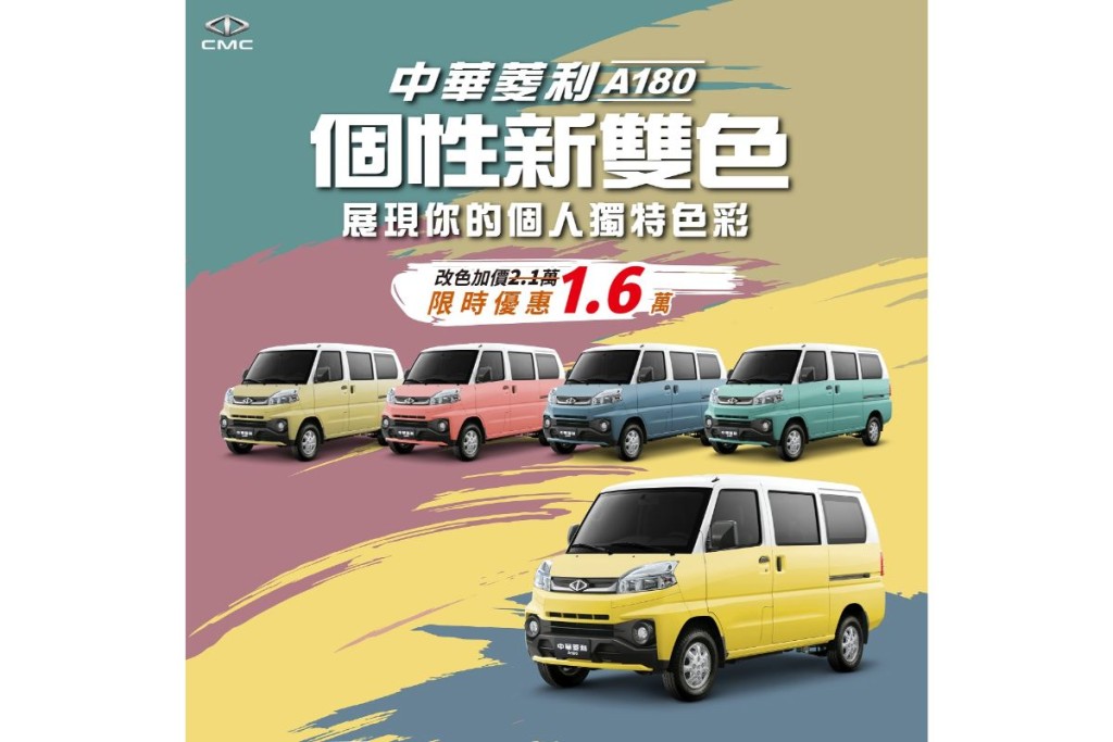 此外,中華汽車為了讓車主的休旅生活增添色彩,自2022年推出中華菱利A180全新雙色奶蓋綠雙色設計自排客貨車與五人自排客車車型後,今年中華菱利再推個性車色,雙色車身塗裝搭配馬卡龍般的粉系色彩,讓你成為路人的焦點,共五個新色沙灘陽光/鴛鴦奶/高山藍/乾燥玫瑰/蒼野綠任你選,原價2.1萬,限時優惠價1.6萬。
