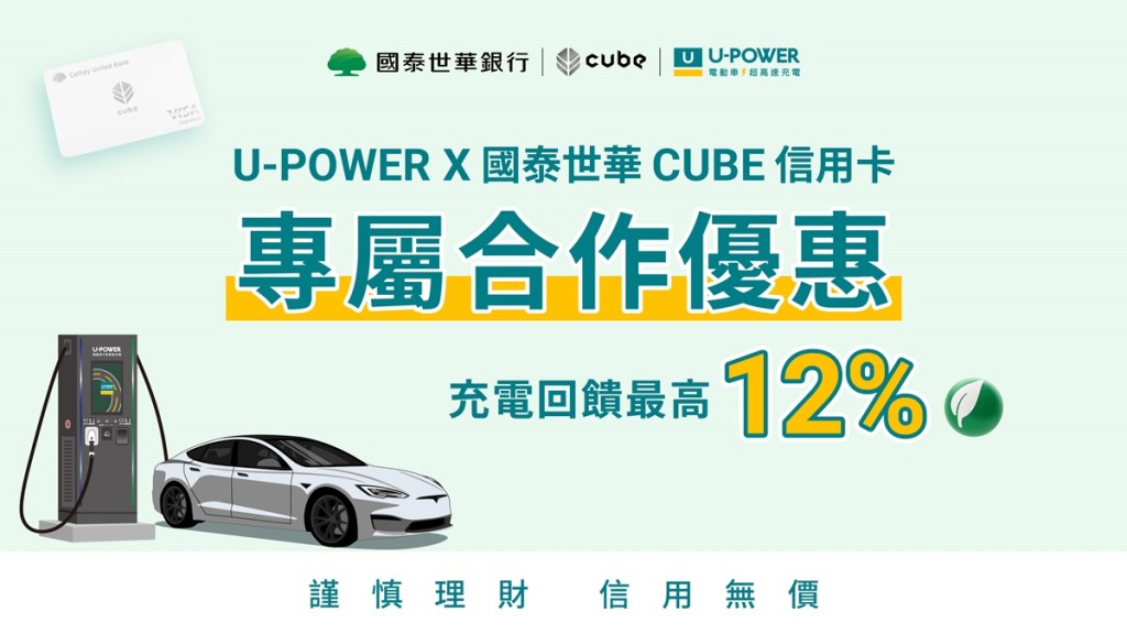U-POWER攜手國泰世華銀行 推出CUBE信用卡充電回饋方案:最高可享12%小樹點回饋