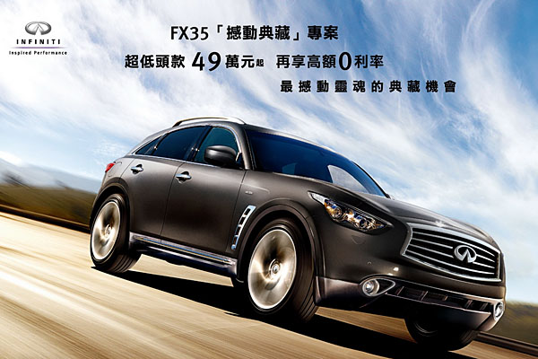 為與台灣消費者共享Infiniti勇奪汽車類「最具情感價值品牌」的至上榮耀,並感謝消費者長期以來對於Infiniti品牌的支持,自即日起至10月31日止,僅需新台幣49萬元超低頭款即可入主擁有F1靈魂的FX車款;而雙雙獲得國際安全(2012 TOP Safety Pick安全首選)及操控(2011 Consumer Report 最佳跑房車)(註4)大獎肯定的M系列及G系列則可享有M車系新台幣209萬元起,G車系新台幣169萬元起的超值限量現金優惠(註5),詳情請參閱Infiniti台灣官方網站www.Infiniti.com.tw,或洽全省Infiniti展示中心或電洽Infiniti免付費服務專線0800-333-399查詢。