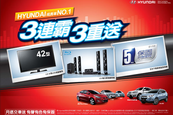 這樣的狀況對總代理南陽實業無不打了一劑強心針,對於已連續兩年國產品牌成長率第一名,在今年成為三連霸的目標越來越近。所以為了慶賀HYUNDAI銷售成長率連續三年稱冠,現在購買乘用車全車系任一車款,在本月底(11月)交車即贈送LG 42型LED液晶電視(42LS3400)+LG藍光家庭劇院組(BH6320H~2013年上市機種,為現售機種HB806TM之升級版本)+五年不限里程延長保固(六大系統)三重送。Hyundai汽車讓你有聲有色有保固,快快樂開新車。