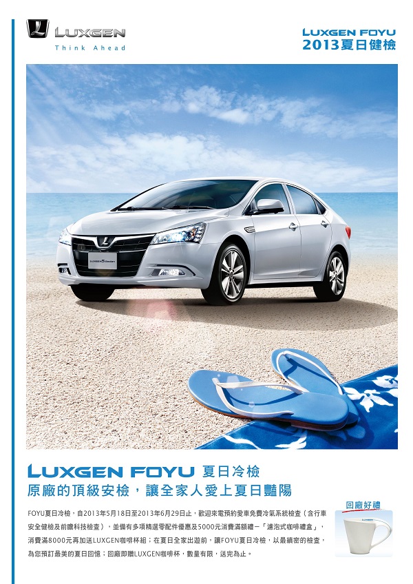 Luxgen以「預先設想、超越期待」的品牌精神服務車主,打造差異化的服務流程,在客休區免費提供iPad2使用、冷熱飲外帶杯、AIO(All-in-One)的充電整合服務、FOYU設備等,更是回饋消費者支持的具體措施,歡迎車主們趁著夏日冷檢的機會回娘家,體驗各項貼心服務,讓所有車主及其家人感受賓至如歸的尊榮感受。欲知更多Luxgen FOYU夏檢訊息,請至官網www.luxgen-motor.com.tw瀏覽,或電洽客服專線0800-588-088。