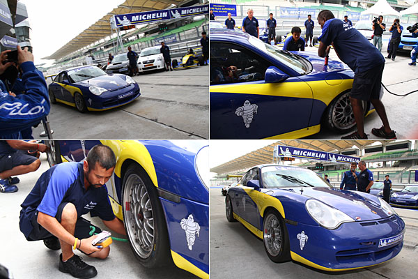 忽然間,遠方駛來一輛Porsche 996 GT3 Cup賽車,工作人員也立刻模擬賽道狀況,迅速將車輛撐起,換胎並檢查車輛基本狀況,讓學員們有親臨賽事的感受。