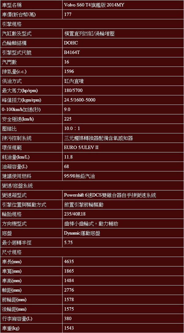 Volvo 2014年式S60 T4旗艦版基本規格表與五視圖