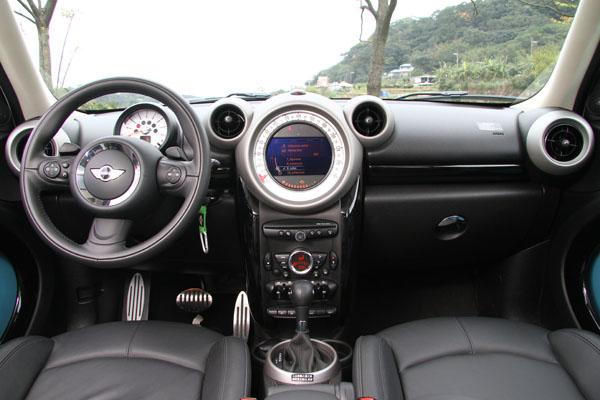 比較起車身外觀,車艙內部的格局鋪陳,Countryman更顯熟悉,由於Cooper S Countryman All4的頂級定位,圓型儀表沒意外的於方向盤後與控台中央出現,如飛機駕駛座艙的撥桿控制介面,也如預期的安置在頂篷前端與控台下方,包含三幅式方向盤、圓型空調出風口、廠徽造形的空調介面等,也依舊襯職的為車艙內點綴設計氛圍,若要論及不同,前後車門整合而成的橢圓區塊、造形特殊的手拉車拉桿,還有中央鞍座部分的Center Rail中央滑軌設計,不過由於試駕車型為標準五人座車款,如果選配四座車型,中央滑軌除了安裝眼鏡盒外,甚至連手機架、杯架等皆可安置其上,前後滑移的機能,應該是Countryman車系中車艙內部最值得向朋友炫耀的特色。