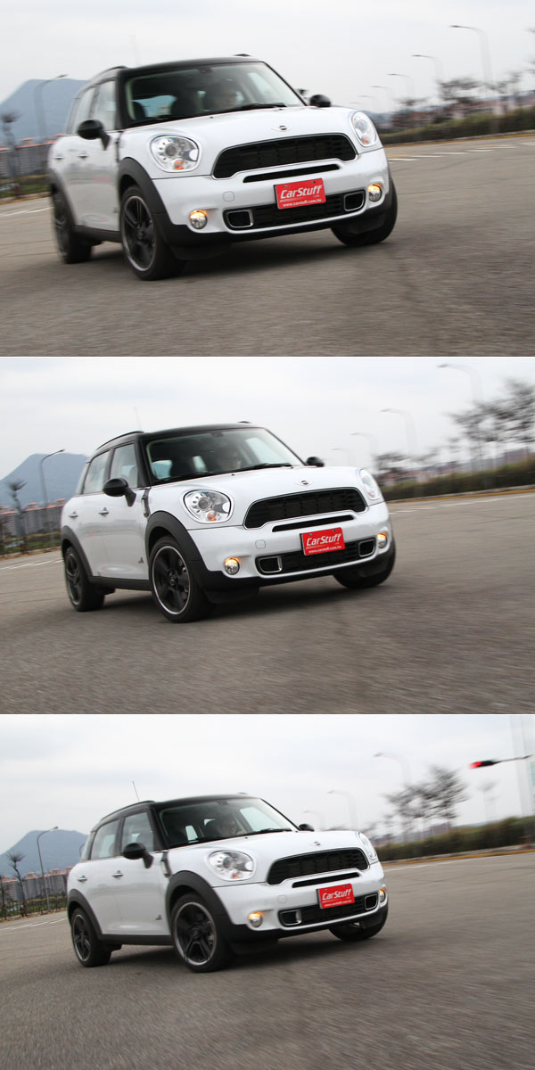 相較於Mini Cooper S多出約莫260kg的Mini Cooper S Countryman All4,還有那底盤中的四輪驅動機構,加速性的表現無可避免的受到影響,除了帳面上達1.1秒的0-100km/h加速時間差異外,Mini Cooper S猛然起步時那扭力轉向、方向盤扯動的刺激快感,已轉換成Mini Cooper S Countryman All4上那較為順暢且飽滿的推進力,且由於四只車輪的同步輸出,驟然加速,車身與車輪都沒有太多抵抗,蹬腳躍起輕巧敏捷,接著為引擎直接的拉轉奔放,由低速一氣呵成的加速曲線,沒有令人皺眉的渦輪遲滯,在刻意調校的排氣聲浪與引擎咆哮中,加分了駕駛者的熱血程度。