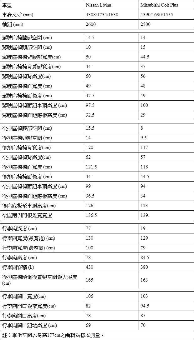 Nissan Livina、Mitsubishi Colt Plus空間比較表: