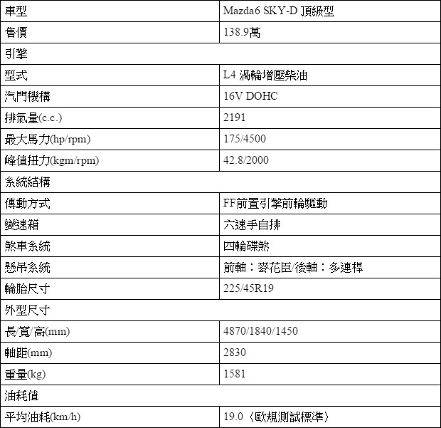 動力系統部分,Mazda6 SKY-D頂級型搭載了2.2升SKYACTIV-D柴油引擎,擁有175ps/4500rpm最大馬力,以及同級車款中最為傲人的42.8kgm/2000rpm最大扭力,並且搭配六速手自排變速系統;然而與部分歐系柴油車較為不同的是,Mazda6 SKY-D雖然有著強大的扭力輸出,但是在動力輸出上卻調得相當線性,動力隨著油門深度的改變,自然且順暢地輸出,不會出過於猛爆的爆衝感,同時還可以保有充沛地加速力道,讓人很容易控制。