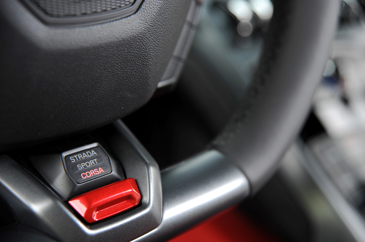 在調整駕姿後,透過中央鞍座上的有如飛彈發射器的引擎啟動鈕啟動引擎後,除了甫發動時的轟然一響,接下來在市區行駛,它在低轉速的引擎與排氣聲浪壓得相當低,只要不猛踩油門,低調的不用擔心它會因為噪音過大而擾民,尤其是將方向盤中央下輻上的ANIMA動態模式選擇器調至STRADA街道模式,會讓它乖得像頭犢牛般溫馴,同時試駕車上還選配了LMR主動式電磁懸吊系統,讓整輛車在舒適與激情間範圍變得更大,也就是說在STRADA街道模式下,它會比配置標準版懸吊車款更舒適,而當切至CORSA賽道模式時的動態極限也會變得更為高強,就像是歌手原本可以唱出兩個八度音,一口氣提升至可以唱到五個八度音,在舒適與極限間的容許度跨得更大,整輛車可呈現的動態表現也更加細緻,相對之下,也許容錯度也跟著加大,但是要能夠將它駕馭到極致,也需要更高強的駕駛功力。
