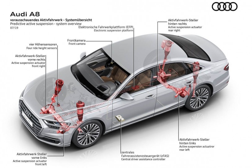 預測性主動懸吊(Predictive Active Suspension)可擁有比電子懸吊更高的乘坐舒適性,並且創造出如同跑車般的操控性能。初期先在歐洲市場於2019年8月開始開放給A8 TFSI車型選配,德國當地的選配價格為5,450歐元。