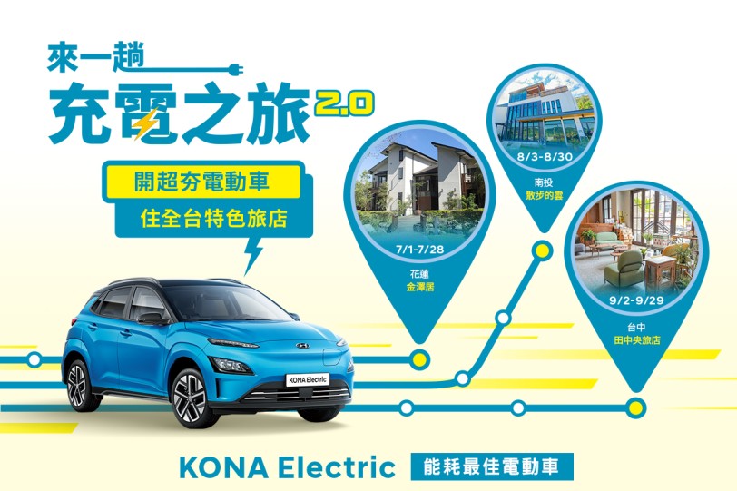 住特色民宿免費體驗電動車,HYUNDAI充電之旅第二波來了。2021年底HYUNDAI汽車與全台特色民宿業者合作,提供國人乘著未來趨勢的電動車體驗不一樣的島內美景,首波選定於宜蘭、台南、屏東的特色民宿業者合作KONA Electric專案,活動推出即造成瘋搶住房體驗全新電動車,充電之旅廣受好評。迎接今年即將到來的暑假旅遊季,7月起HYUNDAI汽車充電之旅第二季將啟程前往花蓮、南投與台中的超夯特色民宿,再次邀請國人暢遊山水,同時體驗零污染知性行程。有興趣的消費者可提前向民宿業者預約,規劃一趟饒富樂趣的電動車之旅。