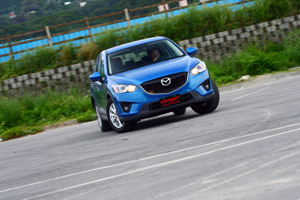 至於在操控性部分,延續了Kuga的試駕感受,Mazda CX-5同樣就像是Mazda3的高底盤化身,有著本次評比車款中最靈活的過彎表現,在較高的速度進彎時,車尾十分活潑,跟進速度最快,外滑的幅度也最為明顯,在以劃定圓方式拍攝時,CX-5是唯一在轉向補油時,車尾會帶出補強車頭轉向的車款,其他車款或多或少都會出現轉向不足、車頭向外推的情形,唯有CX-5幾乎不會出現轉向不足,較小的動力數據,讓它底盤設定強過於動力,所以所提供的樂趣反而也比較多,若是想要一輛好玩的SUV,CX-5是不錯的選擇。
