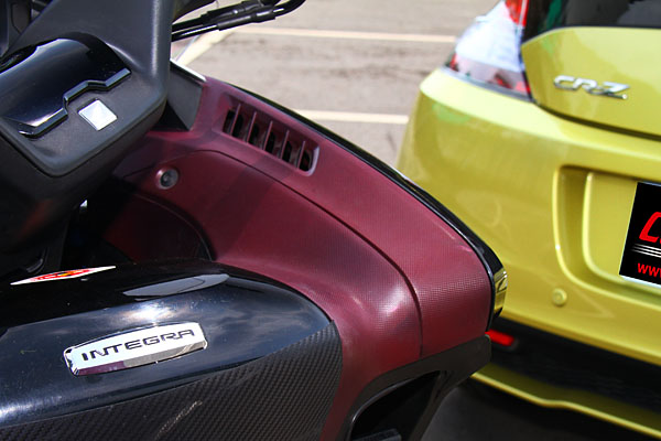 要將兩者結合,取其優勢,勢必也要有所犧牲,在Integra身上,少了傳統大型速克達的座墊下充裕的置物空間,換取的僅有15公升之容積,但鑽石型鋼管車架與前傾62度的直二引擎,讓其重心集中更似檔車;雖然還是沒有檔車那可供其是雙腳夾緊的油箱配置,但重新分布與前後配重,Integra已優於許多大型速克達。