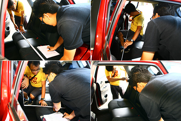 運用捲尺為後座椅面長、寬、地板至車頂高度、椅面距車底高度、後座寬度等數據的實際測量,將後座空間以數據化的方式呈現。
