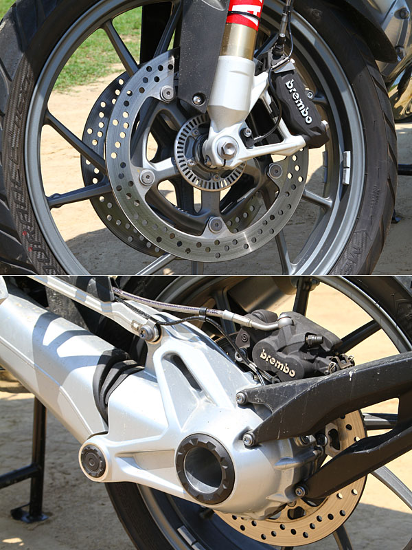 前煞車規格為四活塞固定式卡鉗搭配液壓雙浮動碟盤,碟盤直徑為305mm;後煞車規格為雙活塞浮動式卡鉗搭配固定式碟盤,碟盤直徑為276mm。
