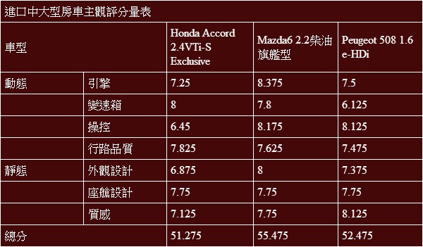 將之量化之後,令人驚訝的是Peugeot 508與Mazda6兩輛柴油車的分數會如此接近,其中508在價格、油耗、空間與上部隔音均有相當不錯的表現,而Mazda6則勝在主動安全以及全方位均衡表現(幾乎各項都是亞軍),反倒是Accord部分在比較吃重的價格與油耗(唯一的汽油引擎)部分屈居劣勢不說,其他大項也沒有真正亮眼的表現足以挽回大局,因此最終以頗為懸殊的差距落於其他兩位對手之後。