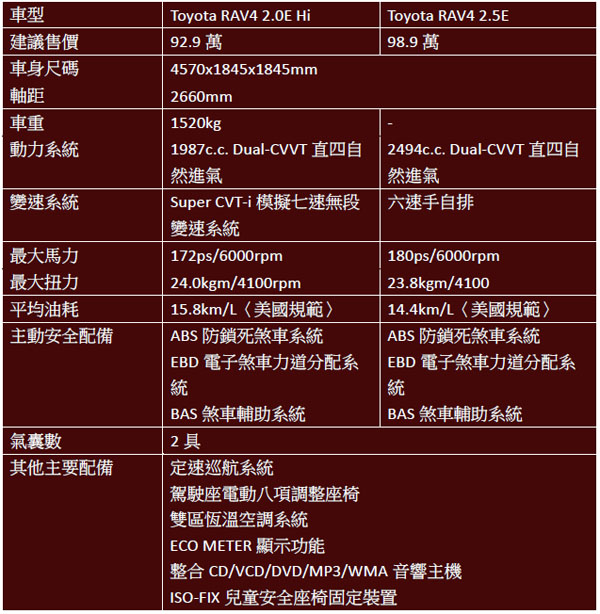 在台灣販售的Toyota RAV4,共有兩款2.0L 2WD、兩款2.5L 2WD與一款2.5L 4WD車型,於車系中建議售價介於90~100萬之間,分別為92.9萬的2.0E Hi與98.9萬的2.5E,其中2.0車型搭載2.0升自然進氣引擎,擁有146ps/6200rpm最大馬力與19.1kgm/3600rpm最大扭力,2.5車型則具備180ps/6000rpm最大馬力與23.8kgm/4100rpm最大扭力。