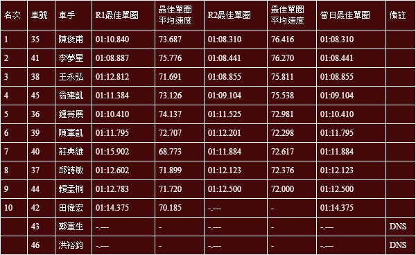 No.2 呂秉儒,當日最快單圈01:02.505。