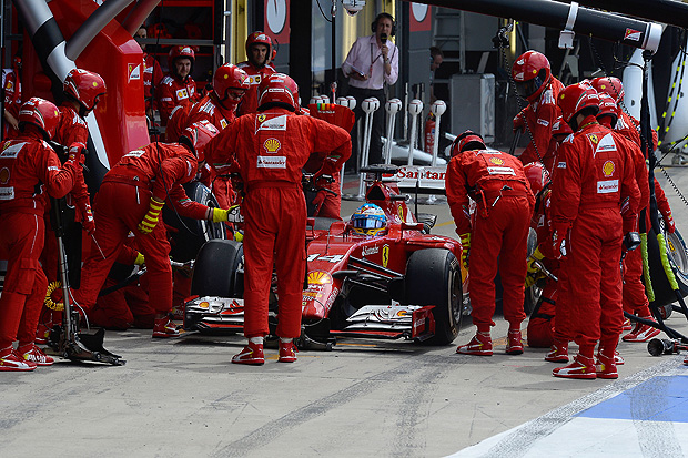 而在賽事正好一半的第26圈,Fernando Alonso終於進站換胎,Ferrari也選擇在此時執行5秒的Stop and Go處罰,所有技師在執行處罰的5秒中時間內皆不得碰處Fernando Alonso的F14 T賽車,直到處罰結束才可進行輪胎的更換。雖然在Pit Lane中耗費較長的時間,但也減少一次進出Pit Lane所損失的時間。回到賽道後,Fernando Alonso也還能名列第9,依然處於積分圈之中。