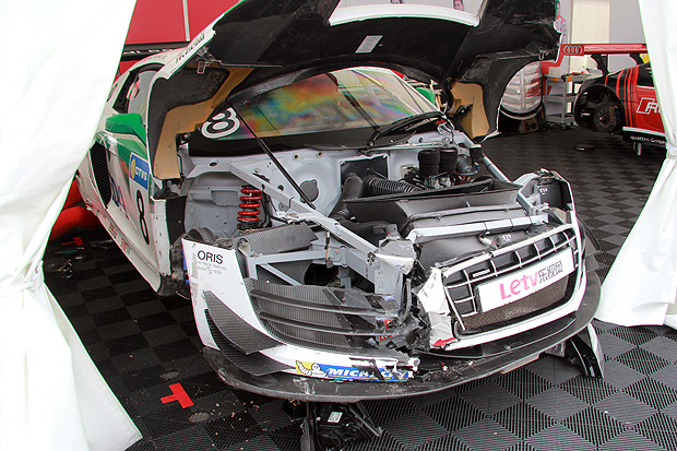 在上午發生事故而引發Safety Car的熊龍,所駕駛的8號賽車在回到車庫後,受損的賽車一度讓人以為難以趕上下午的第二回合比賽。不過,在Audi R8 LMS Cup合作夥伴Absolute Racing的技師努力下,下午開賽前便只剩外觀空力套件的修復,也順利趕上比賽前的Pit Lane開放與繞場圈進入起跑線之中。不過,由於賽道安全官仍未確認賽車是否足以安全進行比賽,技師們仍在起跑線上進行搶修與四輪定位,以求趕上即將開跑的比賽。