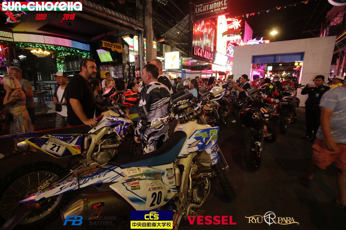 由於從泰國度假勝地芭達雅出發,AXCR大會與當地政府合作,以當地最熱鬧的Walking Street作為發車典禮的地點。由當地警察開道,穿過重重人潮,所有比賽車(單人摩托車27台、雙人摩托車2台、汽車27台),依號碼排序就停在Walking Street正中間,接受當地店家與觀光人潮的注目。