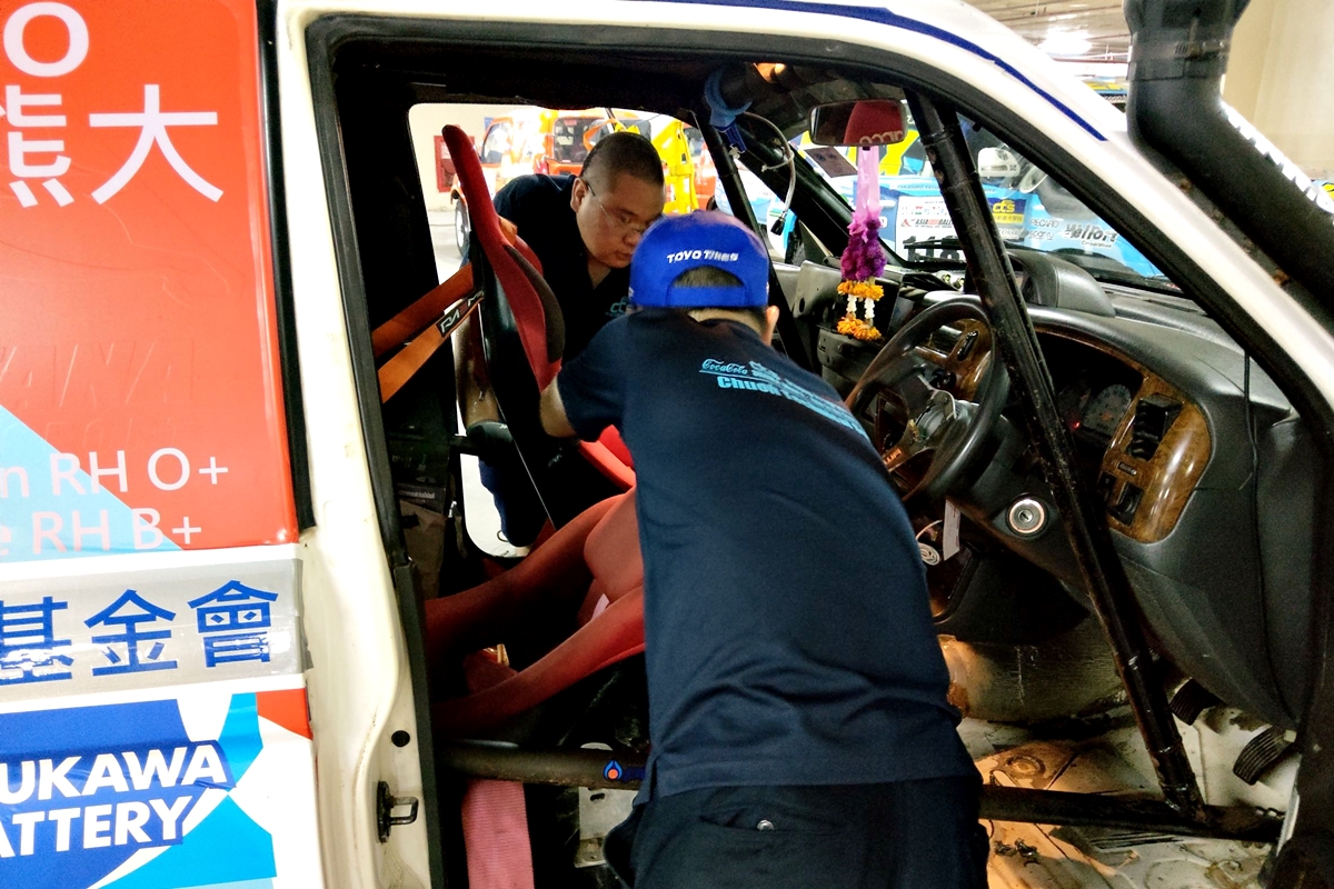 一找到零件,日本自動車大學師生便動工起來,不消一小時時間,就幫台灣號完成了第五點安裝,讓佳穎與我的腰在路況激烈的越野拉力比賽中,多了一層重大的保障。