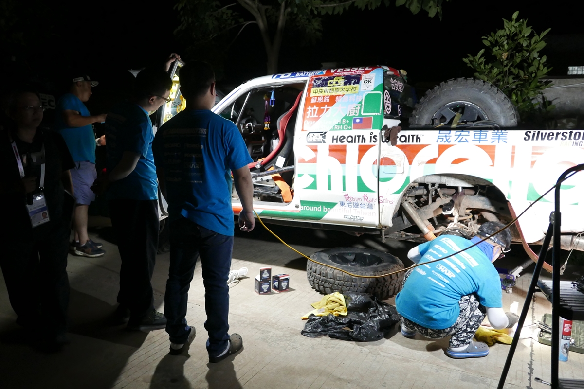 第五天賽程一結束,韓國隊後勤團隊馬上接應到我們,一一詢問賽中情況,左後輪經過搶修,行車動態好很多,只是引擎燈再賽段後半段依然亮起,只是時速多了些,可以達80km,不似前一天只能20km。