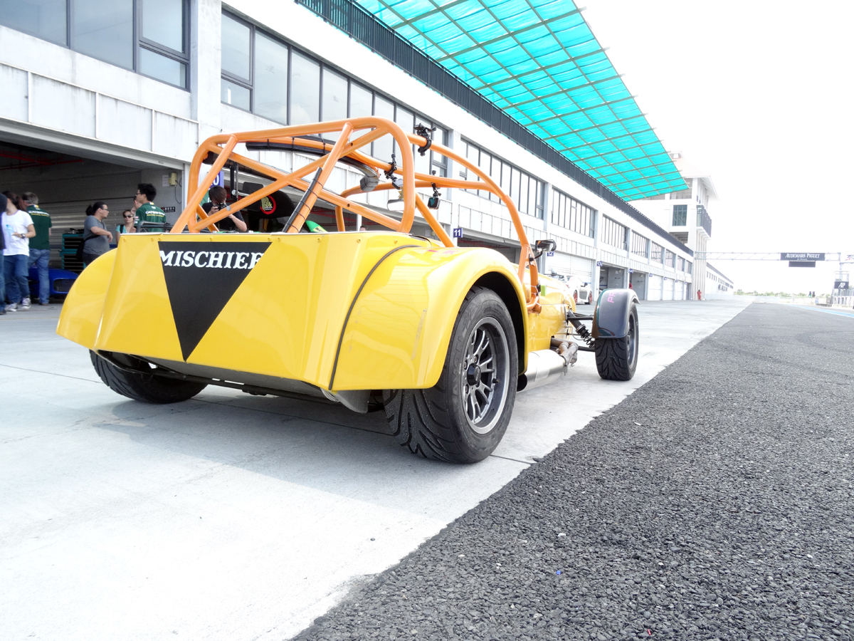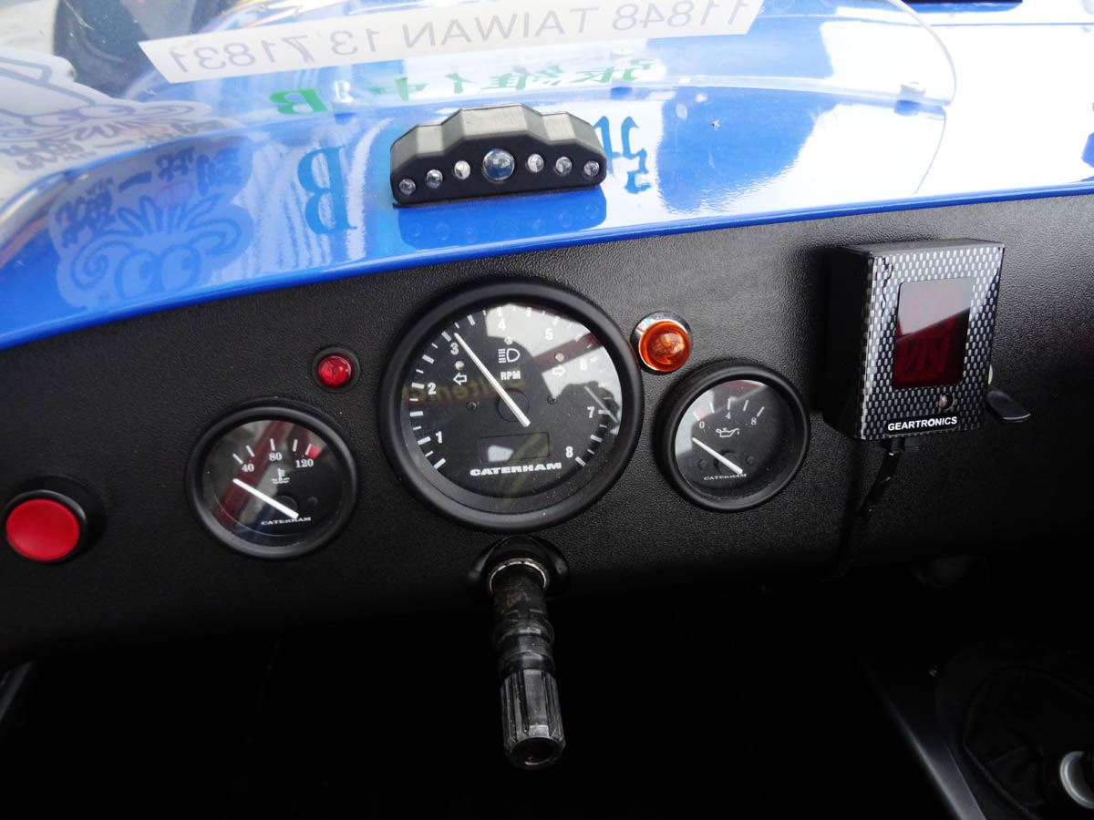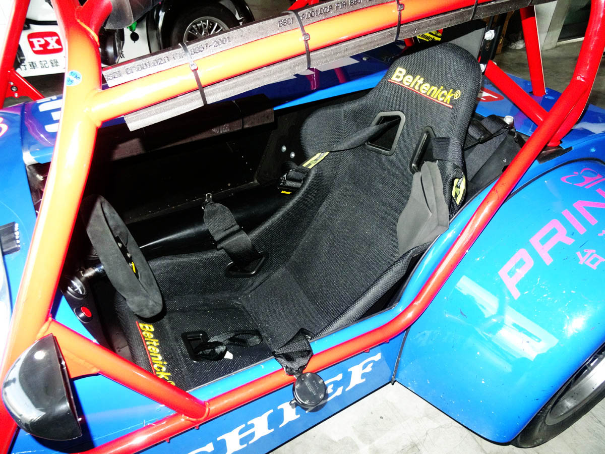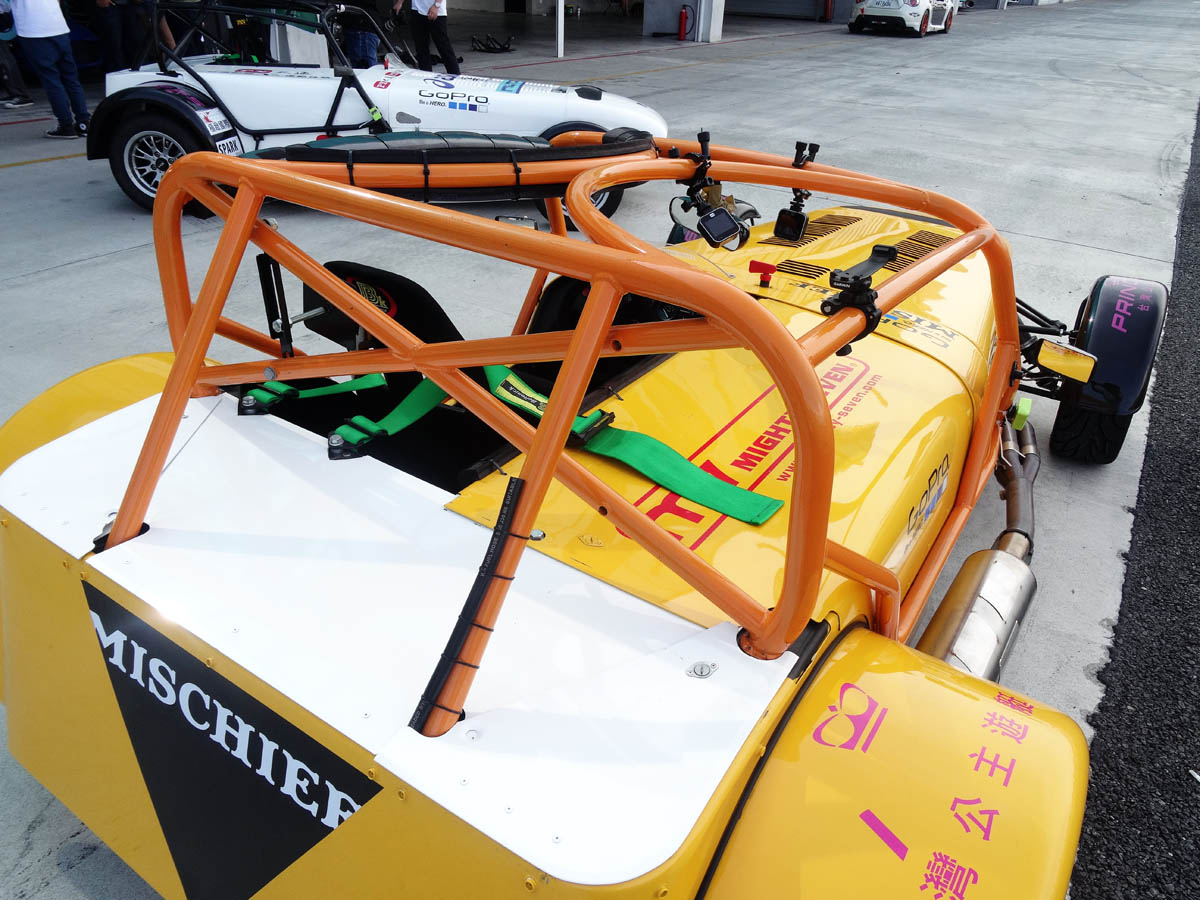 在完成基本換裝後,翻進即將試駕的賽車中,關於翻進配置全套防滾籠的賽車這件事,在先前試駕Superlight R500時就已練就一身好功夫,進出Caterham可說是我的強項,但是上下車很強,對車駕得好不好一點幫助也沒有,首先,我們試駕的車輛,多是統規賽已經在使用的車輛,而且都是採固定是座椅設計,所以每輛車都已經依據車手的身材,將座椅與踏板調整至最適合該位車手的位置,因此Caterham Taiwan只能安排身材與我們最相近的車手所使用之車輛讓我們試駕,然而畢竟每個人的身材比例終究還是有所差異,在事事講究精準的賽車世界裡,「差之毫釐、失之千里」,而筆者分配的車輛為在開幕戰中,成績最佳之台灣車手張維仲車輛,進入車後,發現與踏板的距離還是有些許落差,油門無法以腳掌踩踏,若是要全油門時得稍微以腳尖稍微掂下,才能完全將油門踩下,但油門不好控制,頂多就是開慢點,幸好最重要的煞車還算可以控制,在經過工作人員將自己以六點式安全帶五花大綁,確認安全無虞後,就正式下場試駕。