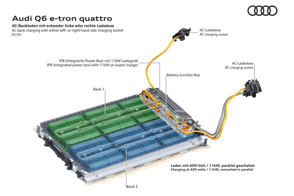 對於面向歐洲市場的PPE車型,Audi計劃透過車輛左後方的CCS組合連接器提供直流和交流充電選項。車輛的另一側將安裝一個額外的交流充電連接器。而Audi Q6 e-tron系列標配11 kW交流電充電系統。這意味著空電池會在一夜之間可完成充電。22 kW的交流充電系統將在以後作為選配提供。充電埠蓋可以透過MMI顯示螢幕方便地打開,也可以在蓋子本身上輕輕按壓開啟。而拔下充電線後,充電口會自動關閉。